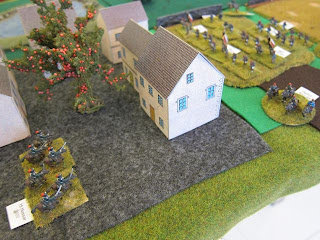 I set up the Divisional Commander in the village, with the reserve (a regiment of Zouaves, hidden) so he could move them to whichever bridge the Prussian main attack developed on.On the right side of the table, the southern bridge was held by 2 regiments of the division, with the bulk of the divisional artillery.